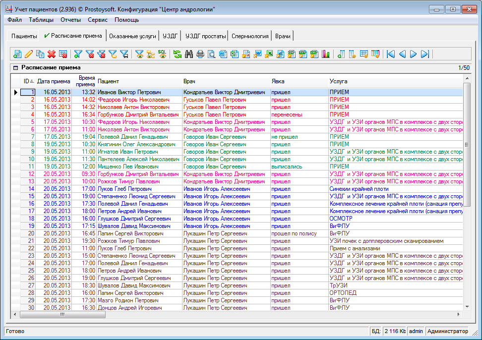 Программа "Центр андрологии" - предназначена для автоматизации работы андрологических центров. Имеется предварительная запись пациентов, контроль оказанных услуг, хранение информации о пациентах и всех их посещений, а также хранение истории болезни каждого пациента. Реализован определенный учет взаимодействия со страховыми компаниями. В результате внедрения данной конфигурации повысится производительность труда персонала, общая эффективность работы медицинской организации и как следствие, прибыль.
