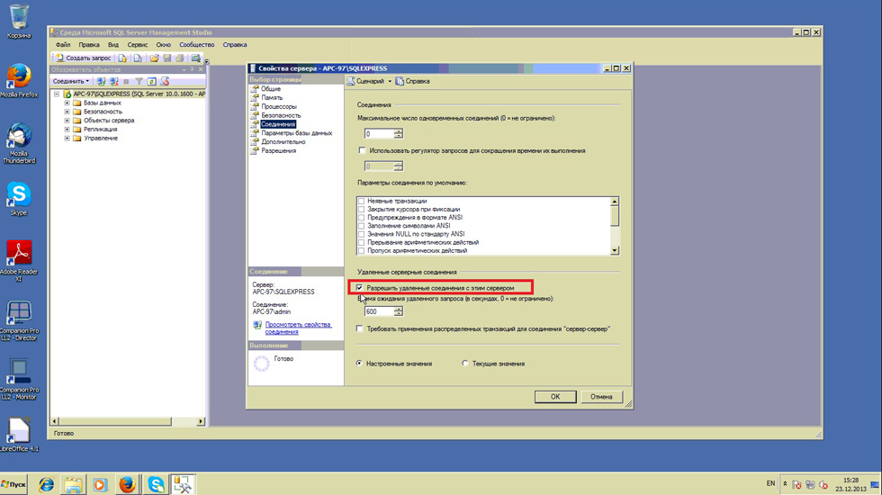 В пункте «Соединения» переключитесь в «Разрешить удаленные соединения с этим сервером».