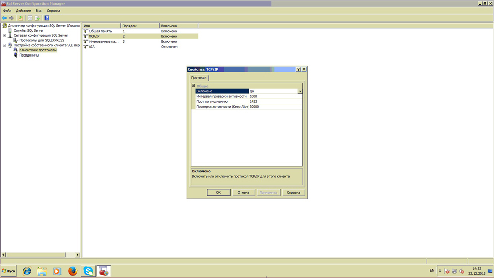 Следующим шагом настроим нам понадобится перейти к дереву Настройка собственного клиента SQL версии 10.0 и в нем подпункт Клиентские протоколы. В этом случае более чем достаточно настроить протокол TCP/IP, который кроме отключения фильтрации фаервола и указания при соединении, больше не требует настроек. Так же не рекомендуется вносить изменения в нумерацию портов, но если Вы все же измените порт по умолчанию (1433), то следует разблокировать его в Firewall.