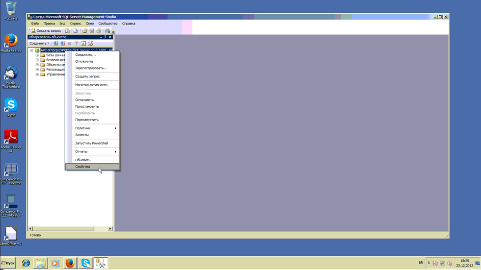 Далее начните работу с Microsoft SQL Server Management Studio. Перейдите в «Свойства» сервера, вызвав контекстное меню на нем.