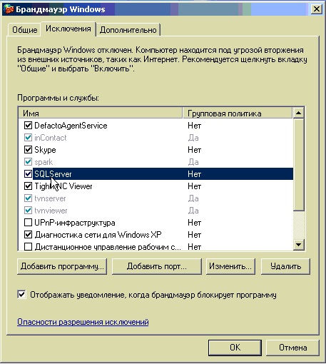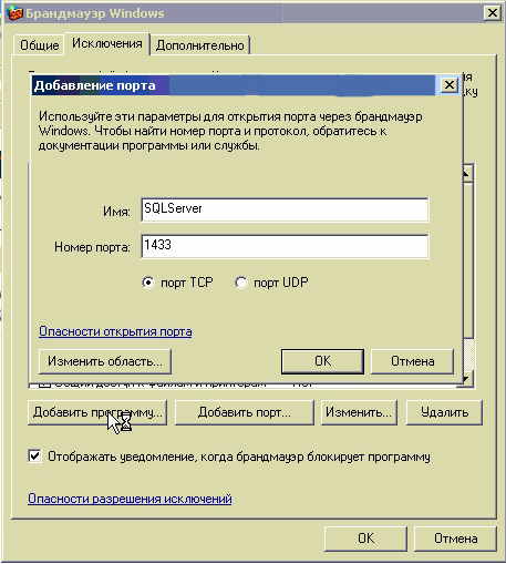 В новом окошке переключитесь на вкладку «Исключения», выберете опцию «Добавить порт», а после этого опишите правило, например «SQL Server», номер порта – 1433 (указан был ранее) и тип порта «TCP». Нажмите «Ok».