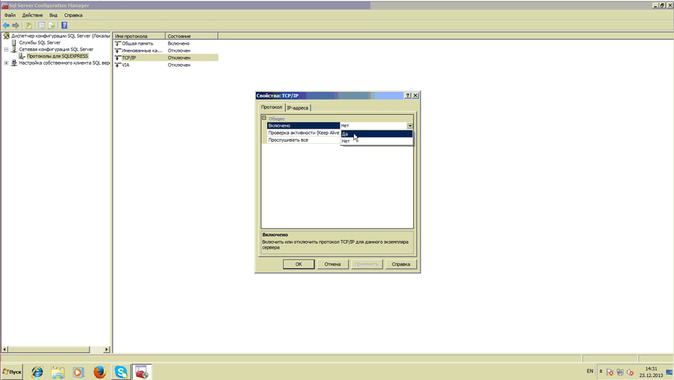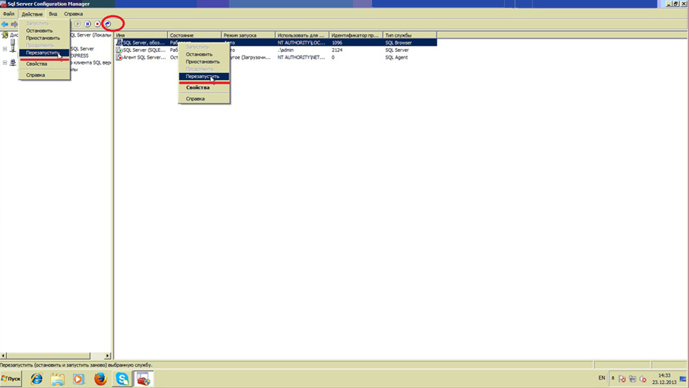 Закончив с настройкой протокола, найдите в «Службах опцию SQL-сервер» триггер перезапуска сервера. А также обратите внимание на то, чтобы обозреватель SQL-сервер был в состоянии "Работает".