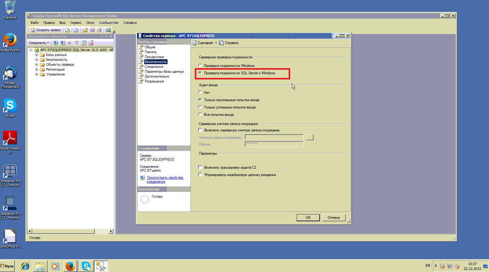 Установите переключатель в режим «Проверка подлинности SQL Server и Windows», он находится в меню «Безопасность».