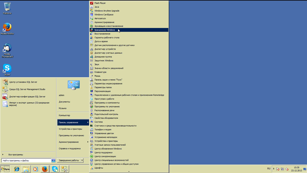 В случае, если у Вас разрешен любой файервол, есть необходимость открыть порт 1433 (во время настройки портов, мы должны были его отконфигурировать). Для старта работы Windows Firewall, нажмите меню Пуск => Панель управления => Windows Firewall (в русскоязычных версиях «брендмауер»).