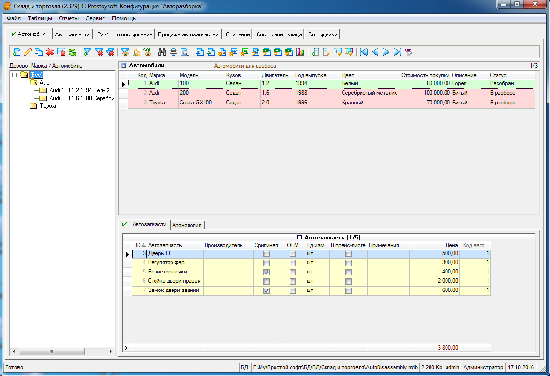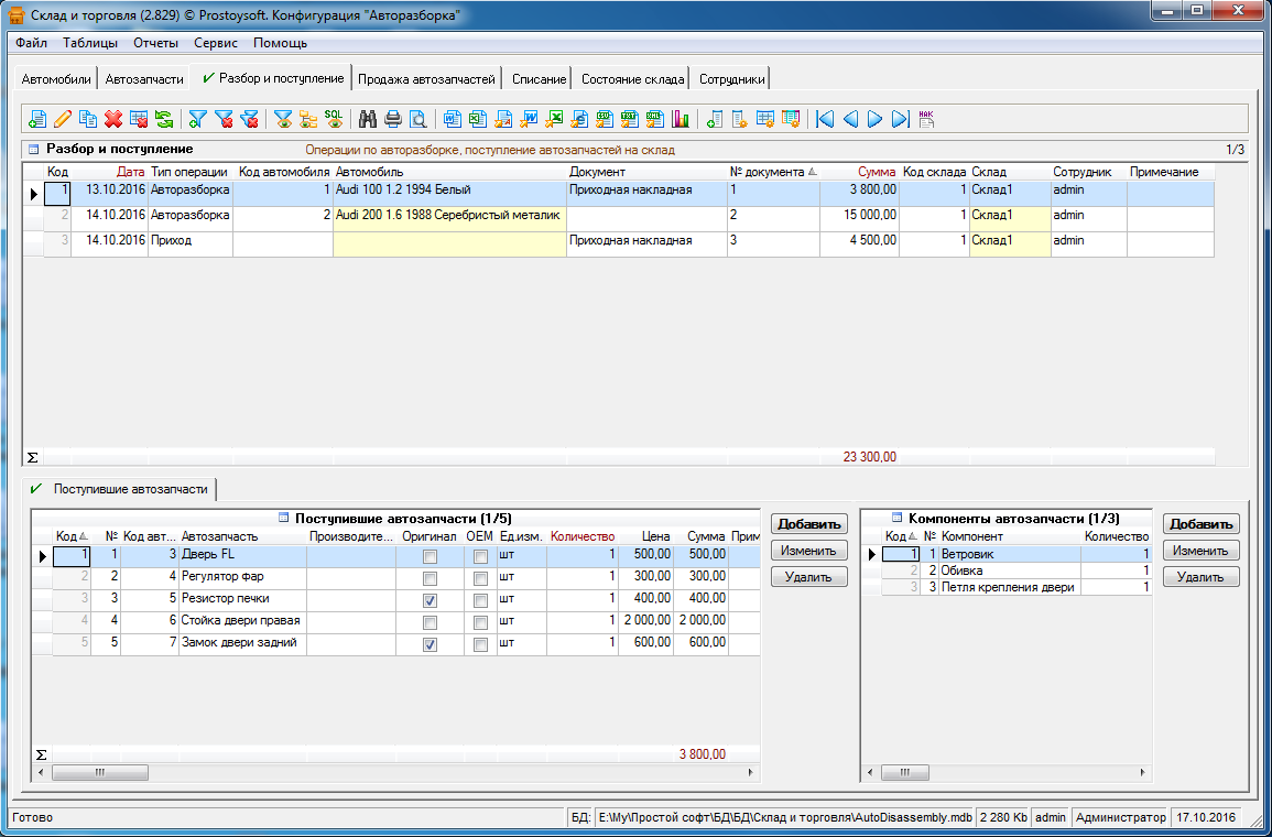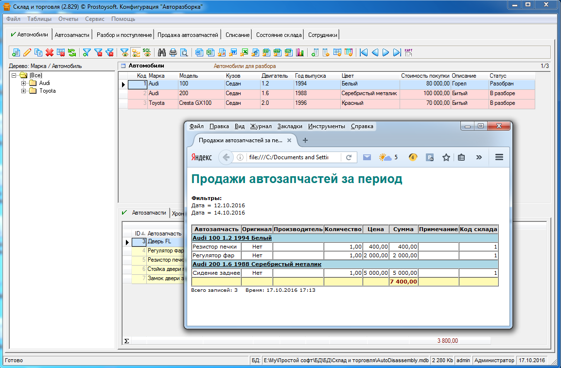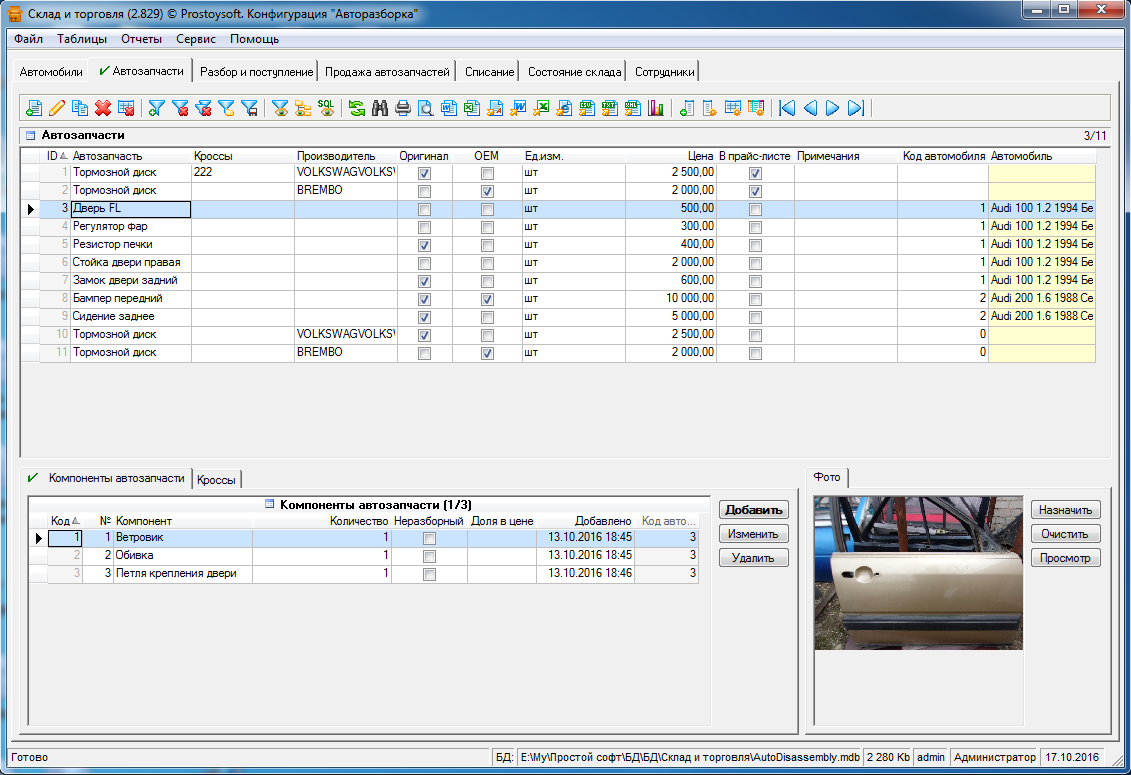 Программа "Авторазборка" - предназначена для автоматизации ведения учета в магазинах автозапчастей и авторазборок. Данная программа позволяет вести учет автомобилей-доноров и их запчастей, а так же новых запчастей с их компонентами для последующей продажи. Имеется возможность подбора взаимозаменяемых автозапчастей, ведение складского учета, учета заказов и продаж, хранение контактной информации клиентов.