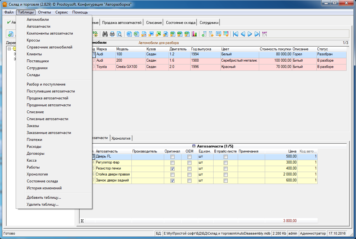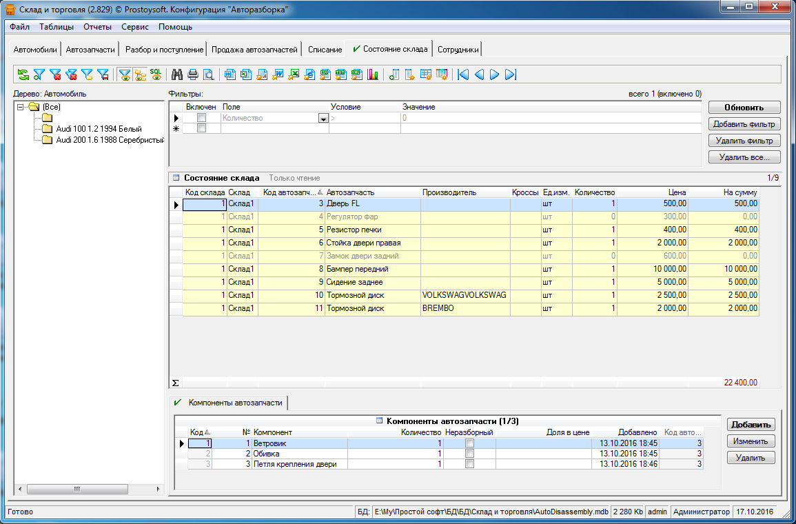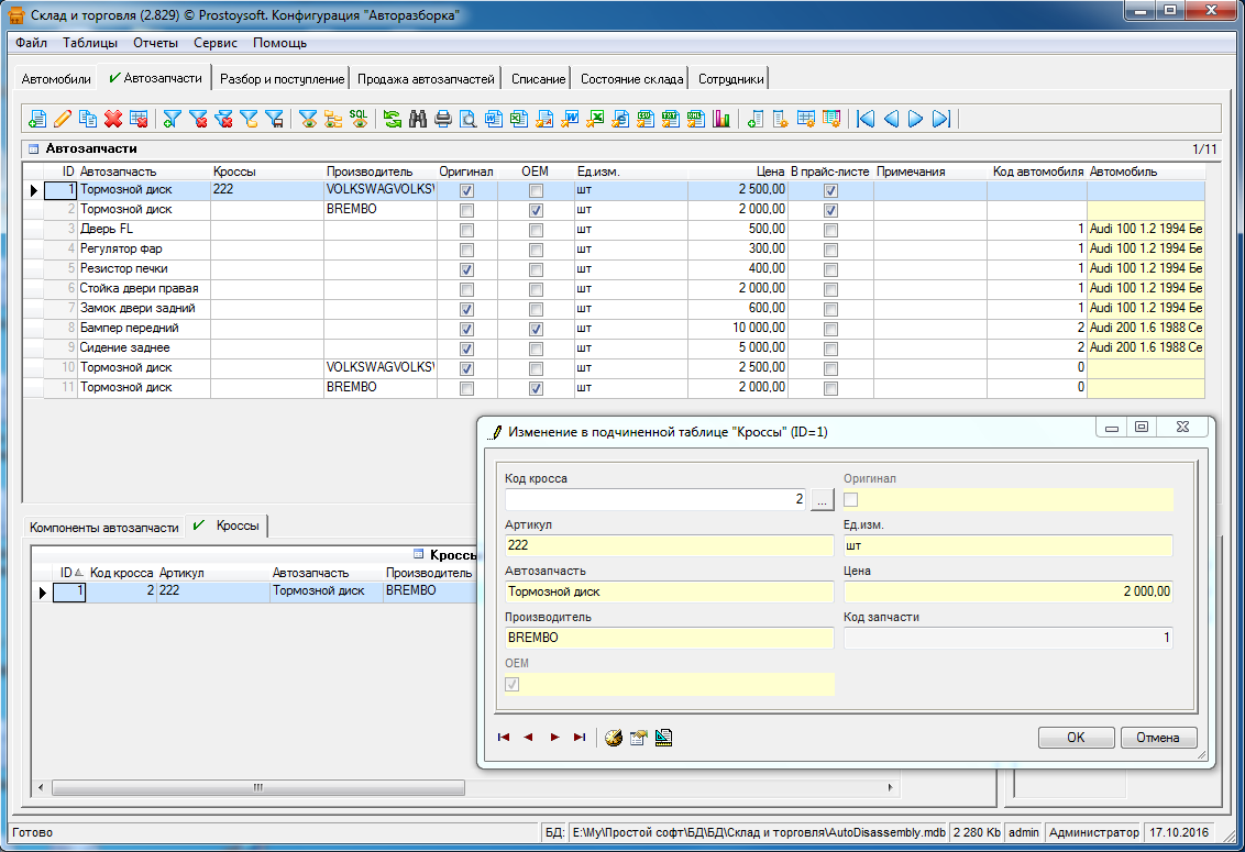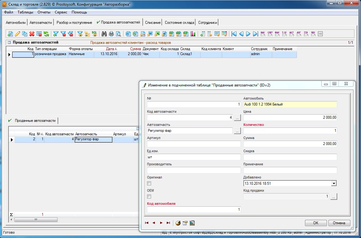 Программа "Авторазборка" - предназначена для автоматизации ведения учета в магазинах автозапчастей и авторазборок. Данная программа позволяет вести учет автомобилей-доноров и их запчастей, а так же новых запчастей с их компонентами для последующей продажи. Имеется возможность подбора взаимозаменяемых автозапчастей, ведение складского учета, учета заказов и продаж, хранение контактной информации клиентов.