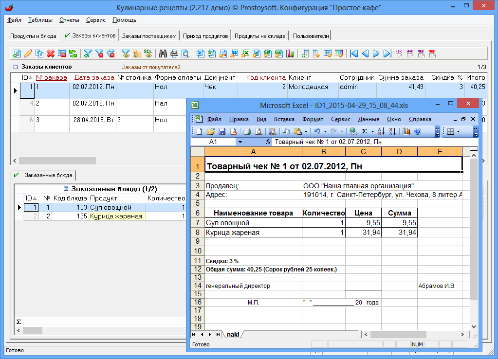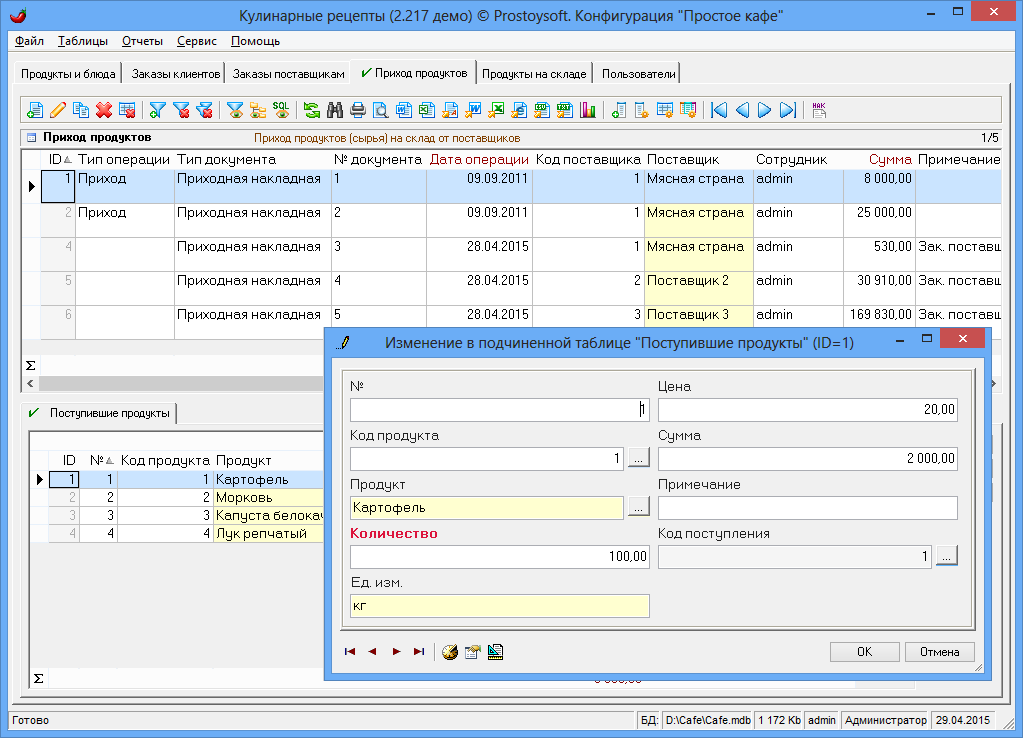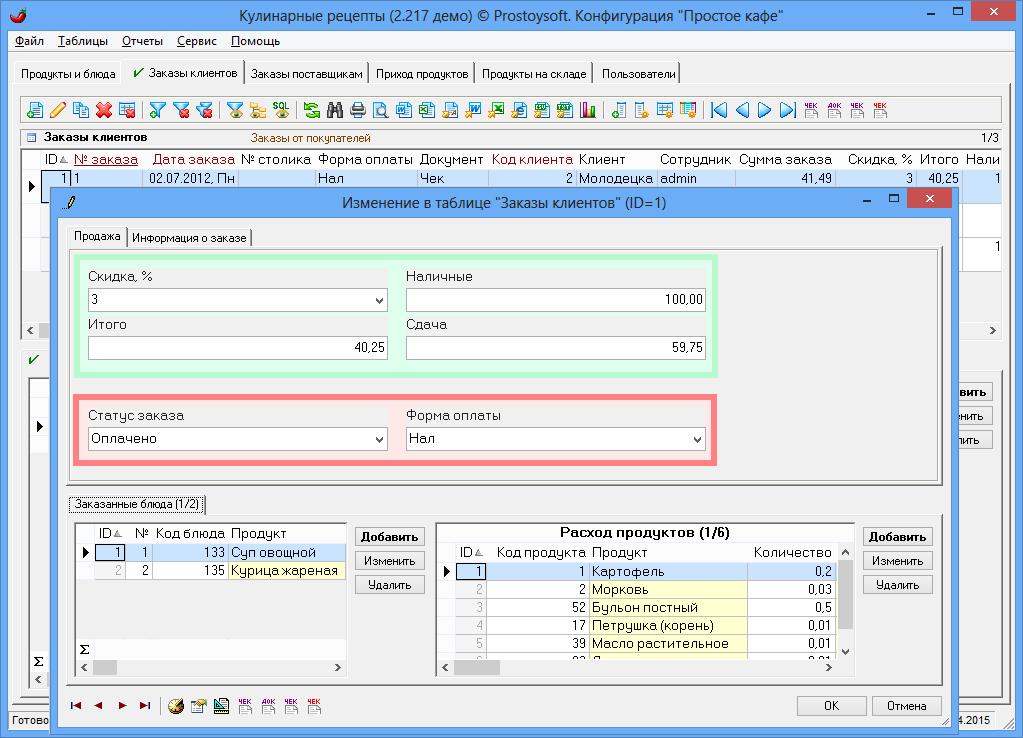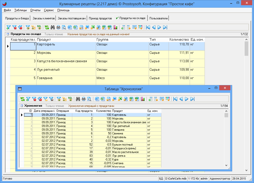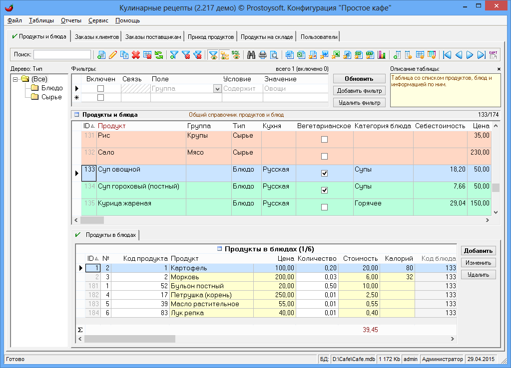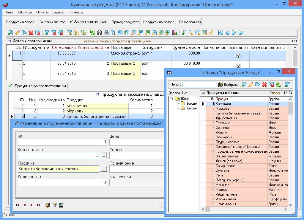 Программа "Простое кафе" - предназначена для автоматизации ресторанов, кафе, столовых, служб доставки еды и других организаций сферы питания. Программа позволяет автоматизировать процесс составления калькуляционных карт, меню, блюд, движения продуктов на складе, контролировать работу сотрудников, вести полный спектр работ с заказами (прием, оформление, оплата), существенно повысить скорость и качество обслуживания гостей, сократить затраты предприятия и увеличить прибыль.