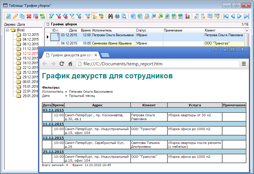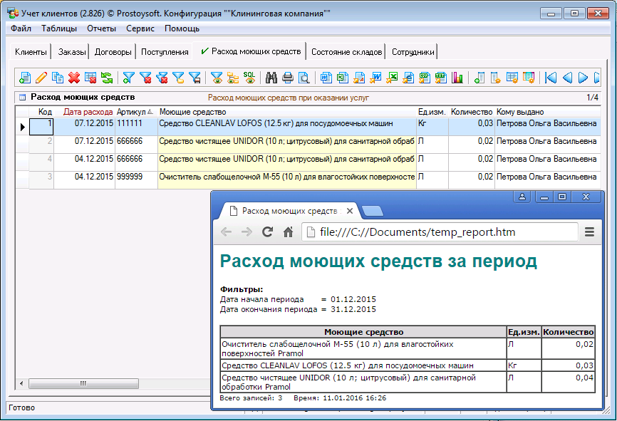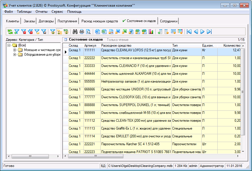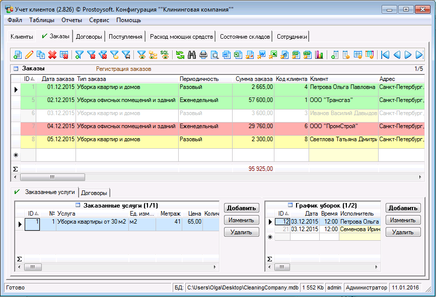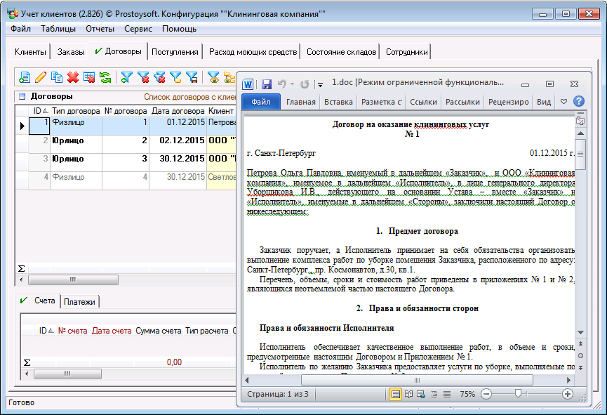 Программа "Клининговая компания" предназначена для автоматизации работы компаний осуществляющих оказание услуг в сфере клининга. Данное программное решение позволяет вести базу по клиентам, регистрировать заказы, осуществлять подбор исполнителей по заказу, вести учет договоров с клиентами, учитывать расход моющих средств, вести расчет заработной платы персонала, а так же решать многие другие задачи позволяющие усовершенствовать процесс учета в клининговой компании.