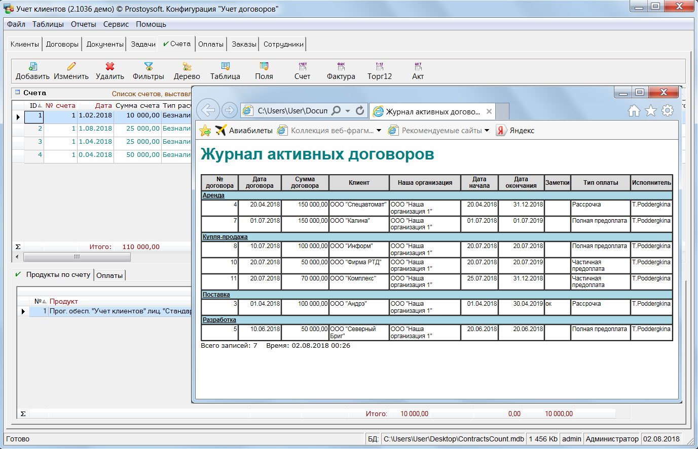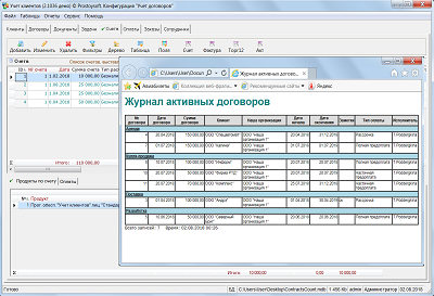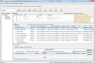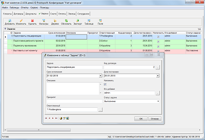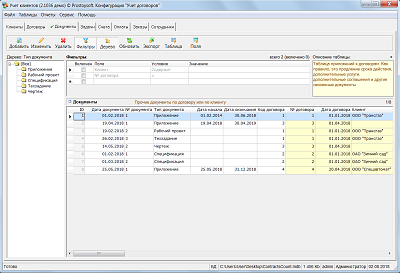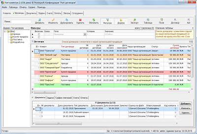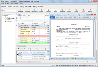 Программа "Учет договоров" - предназначена для автоматизации работы с договорами и другими документами. Данная программа позволяет вести учет не только договоров и документов, но и всех клиентов организации. Вести учет поставленных задач, следить за выполнением этих задач, формировать счета, акты, накладные и прочите закрывающие документы, генерировать договора по шаблонам одним кликом, вести контроль оплат по выставленным счетам. Система напоминаний оповестит пользователей об окончании сроков действия договоров и прочих документов.