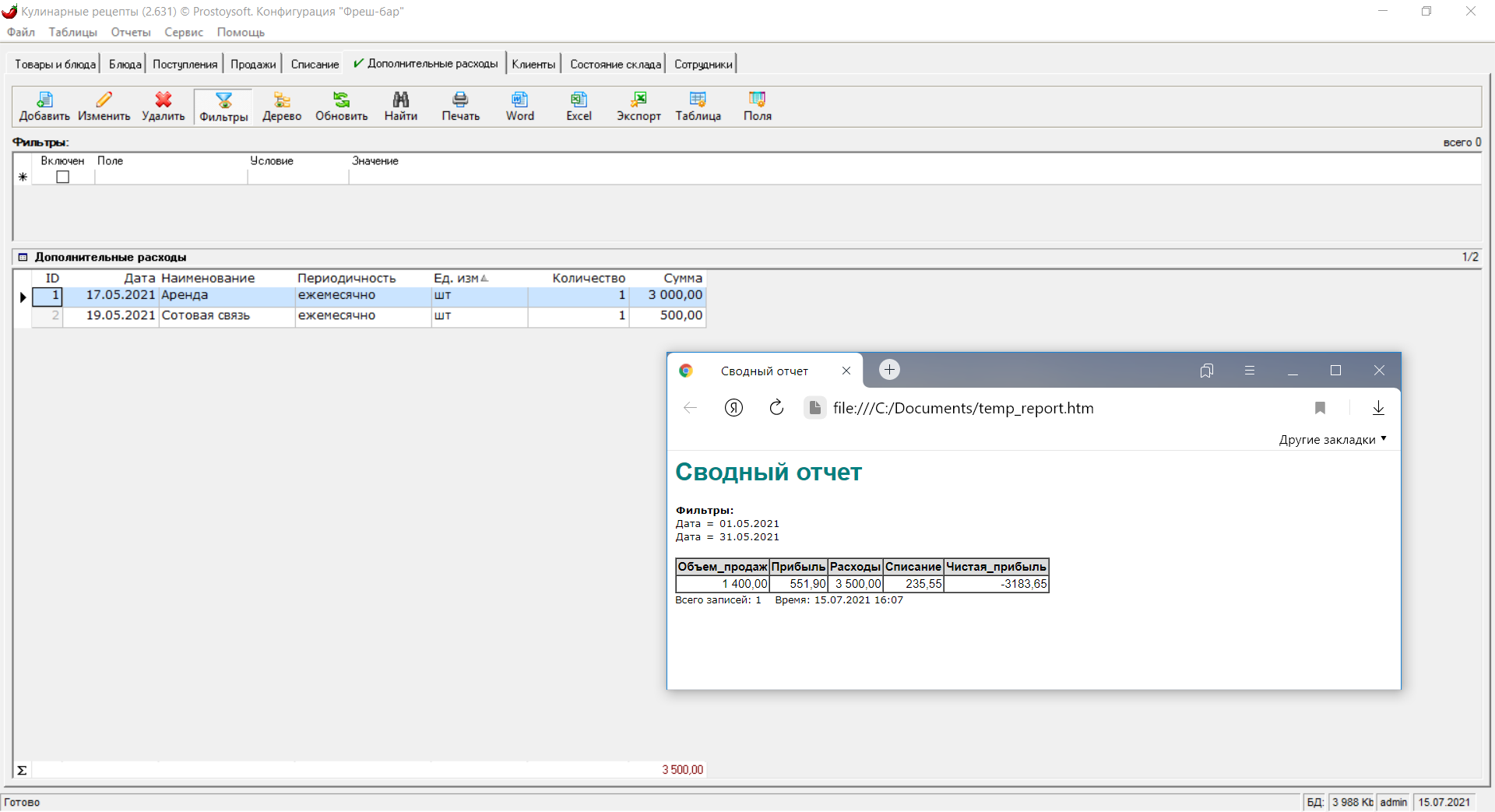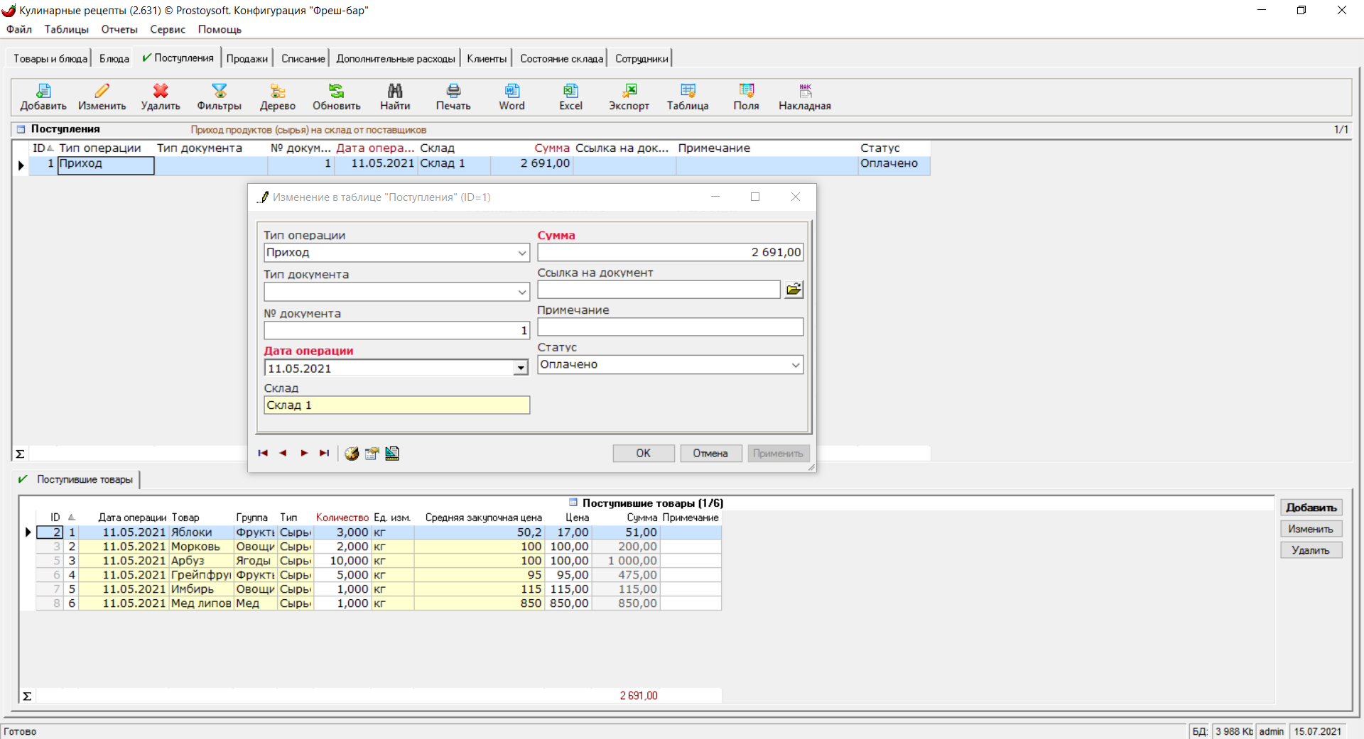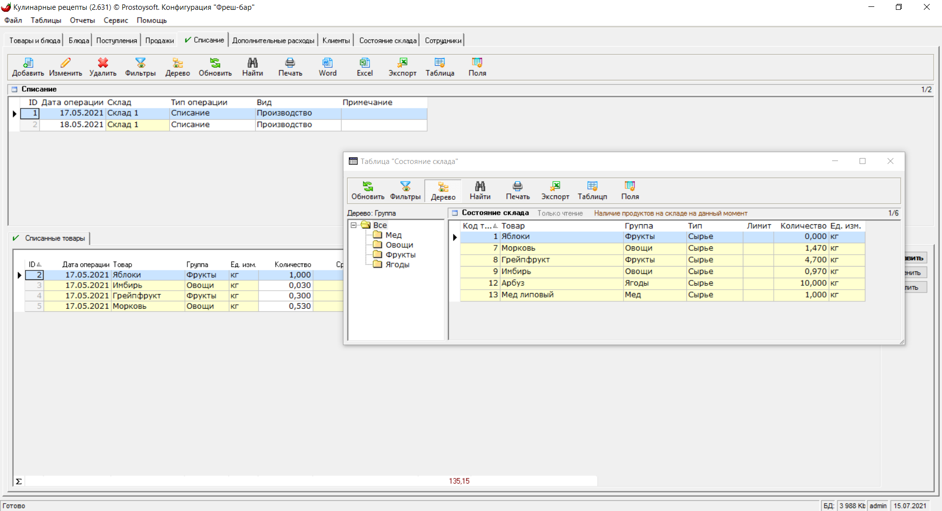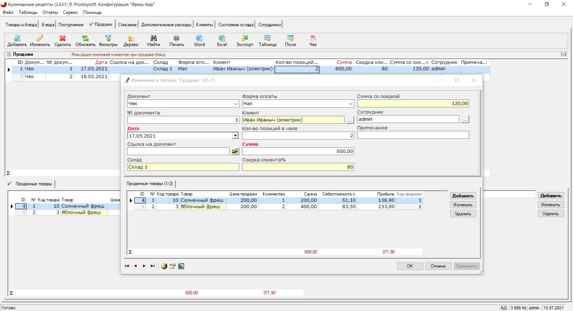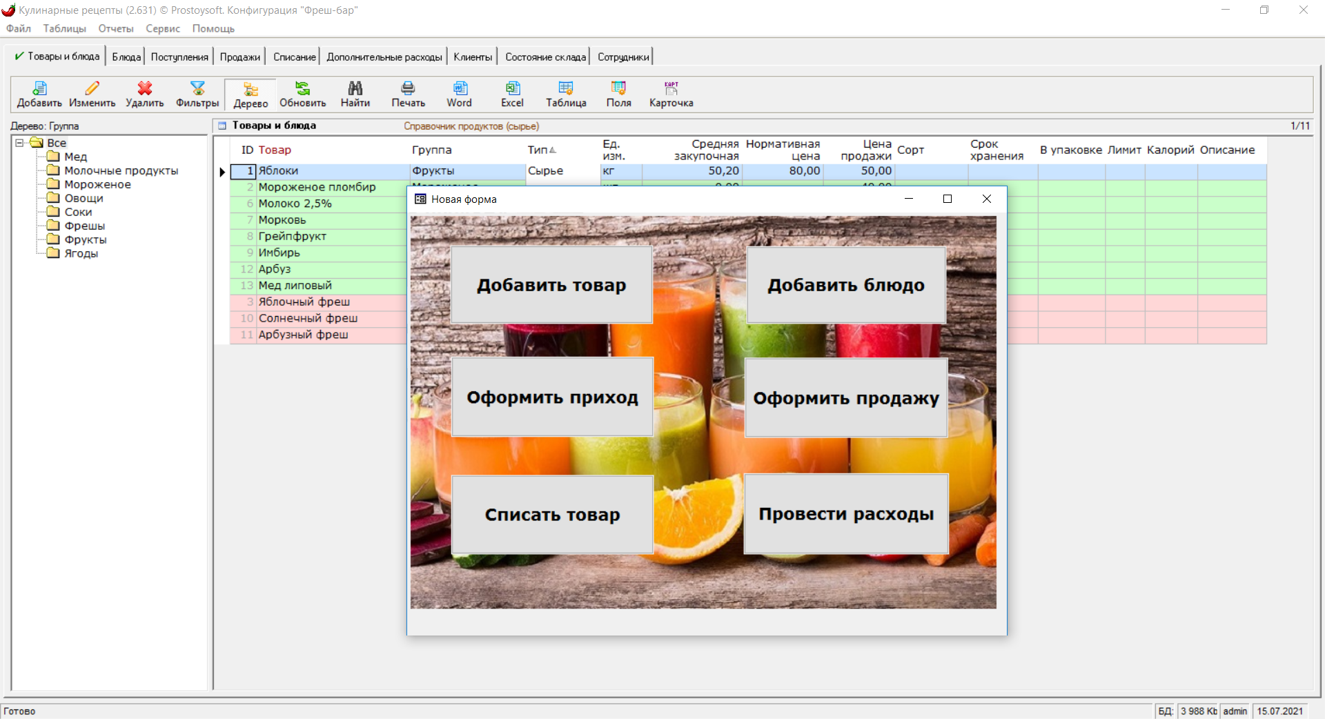 Программа "Фреш-бар" - предназначена для автоматизации фреш-баров, кафе, ресторанов и других заведений/точек продаж. Подходит для использования при стационарной или выездной торговле. Данная программа позволяет вести базу товаров/справочников рецептов напитков, коктейлей и блюд с указанием долей компонентов и стоимости (каждого из них, и калькуляция блюда или напитка целиком). Есть возможность быстрого добавления новых рецептов и справочников. Специализированная форма для этого активируется одной кнопкой. Возможен импорт данных в справочники из сторонних источников в формате Excel, CSV и в других. Ведение учета товаров на складе, через конфигурацию можно проводить поступление и списание товаров (ингредиентов для напитков и коктейлей), что позволит отказаться от использования отдельных специализированных программ. Ведение учета продаж и инструменты для повышения лояльности клиентов. В конфигурации имеется функционал для формирования чеков и фиксации платежей при продаже блюд. При подготовке чека есть возможность указания персональной скидки для покупателя: итоговая сумма рассчитывается автоматически, с ее учетом. Ведение учета дополнительных расходов (аренда, транспортные услуги, связь и т.д.). Учет сотрудников: ведение базы, изменение личной информации, управление правами и полномочиями работников и т.д.
