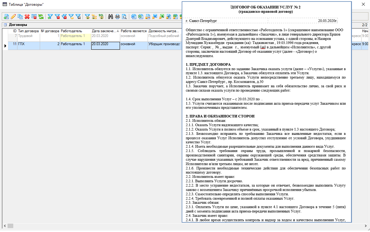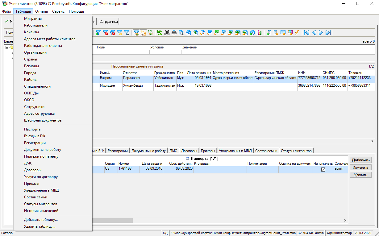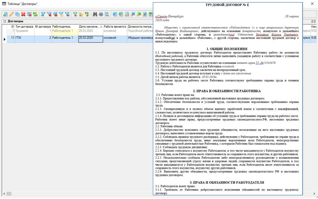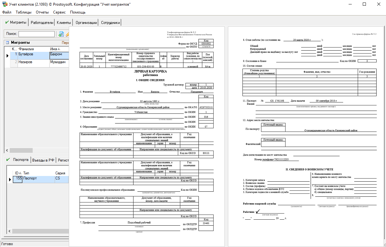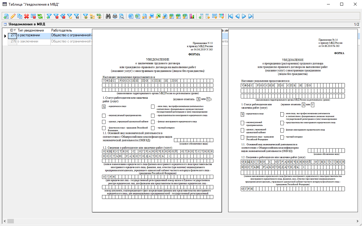 Программа "Учет мигрантов" - предназначена для автоматизации ведения учета в организациях, привлекающих иностранных граждан в качестве работников и в компаниях, оказывающих услуги аутстаффинга. В программе можно легко и быстро создавать и распечатывать уведомления о заключении/расторжении трудовых договоров с иностранным гражданином, приказы о принятии/увольнении/отпуске, трудовые договора, договоры ГПХ и другие документы. В программу "Учет мигрантов" входят полные классификаторы ОКВЭД, ОКСО, субъектов Российской Федерации и прочие. Если у иностранных граждан заканчивается разрешение на работу, трудовой договор, регистрация и прочие документы, программа сообщит вам об этом, выделением записи в таблице красным фоном. Система напоминаний не даст забыть об окончании сроков действия тех или иных документов, а также платежей по патентам. Конфигурация легко и быстро настраивается под конкретные требования заказчика.