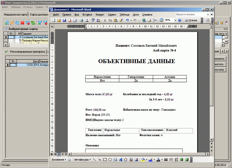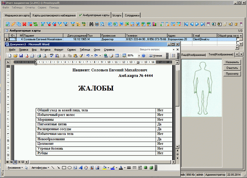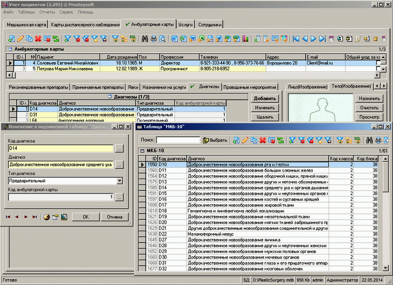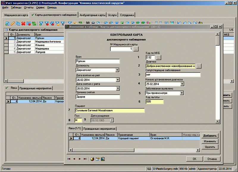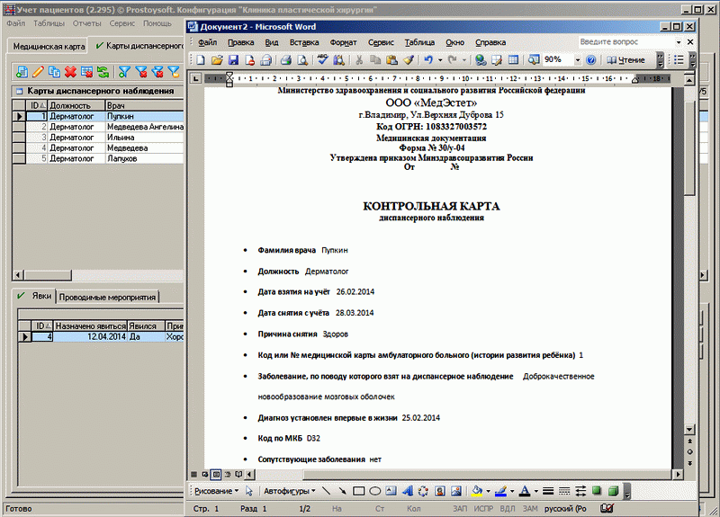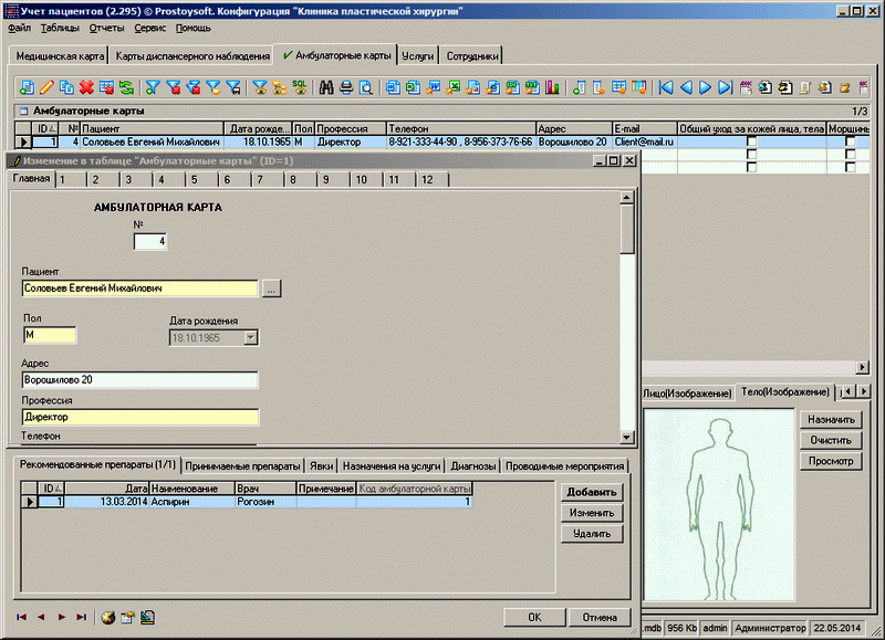 Программа "Клиника пластической хирургии" - предназначена для автоматизации работы в клиниках пластической хирургии. Данная программа позволит автоматизировать работу клиники - рецепции, рабочие места врачей, бухгалтерии, вести учет необходимой документации.