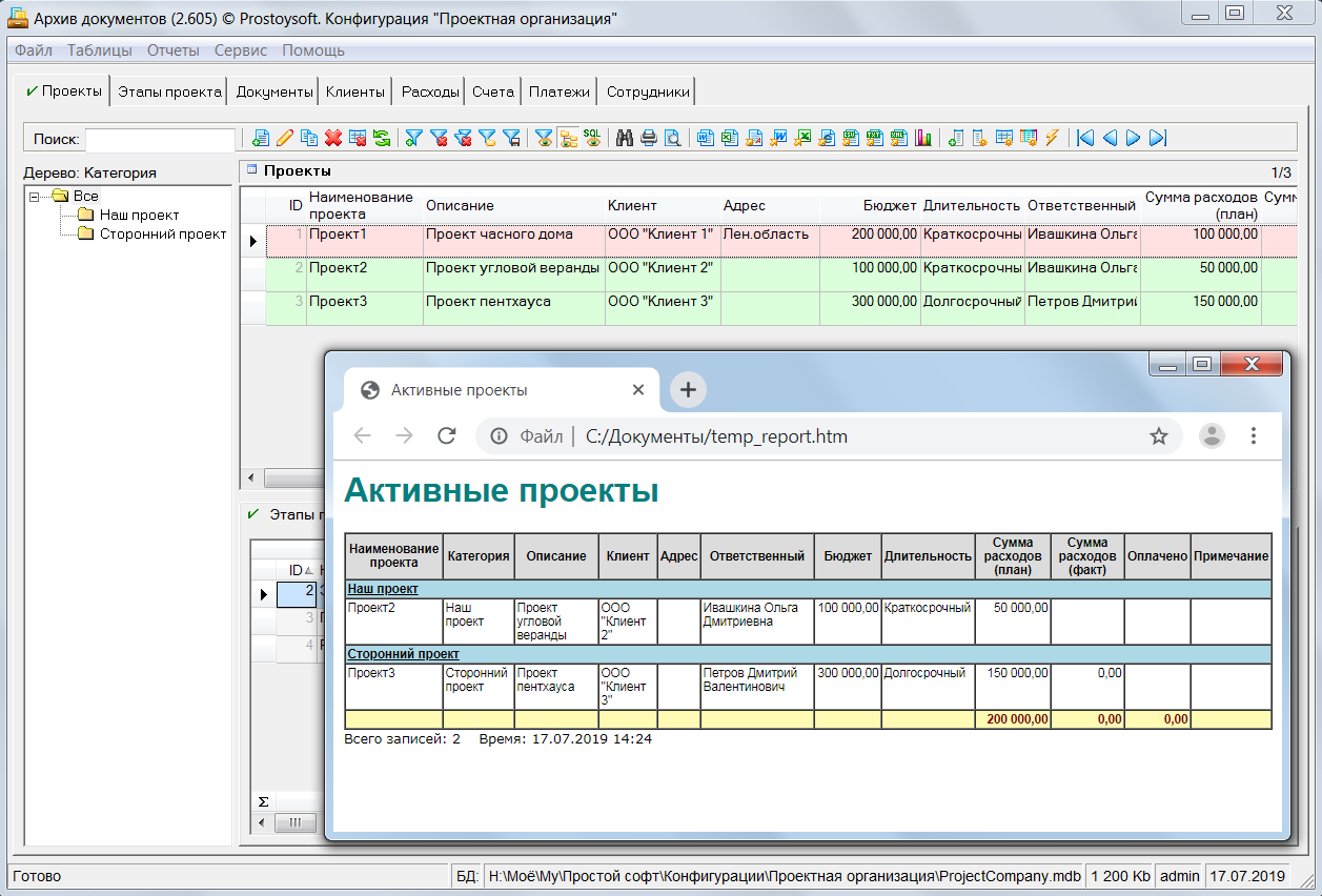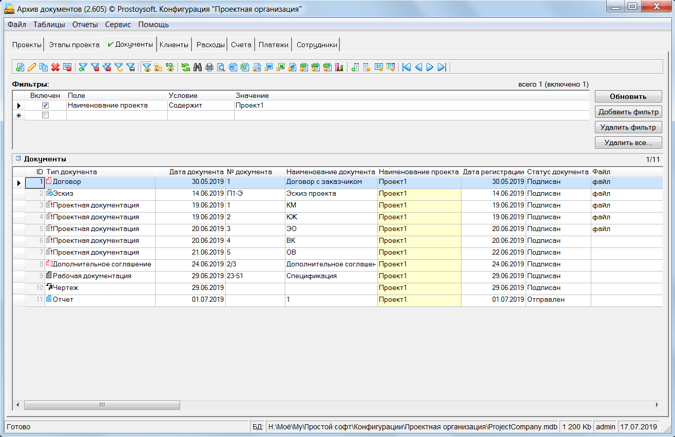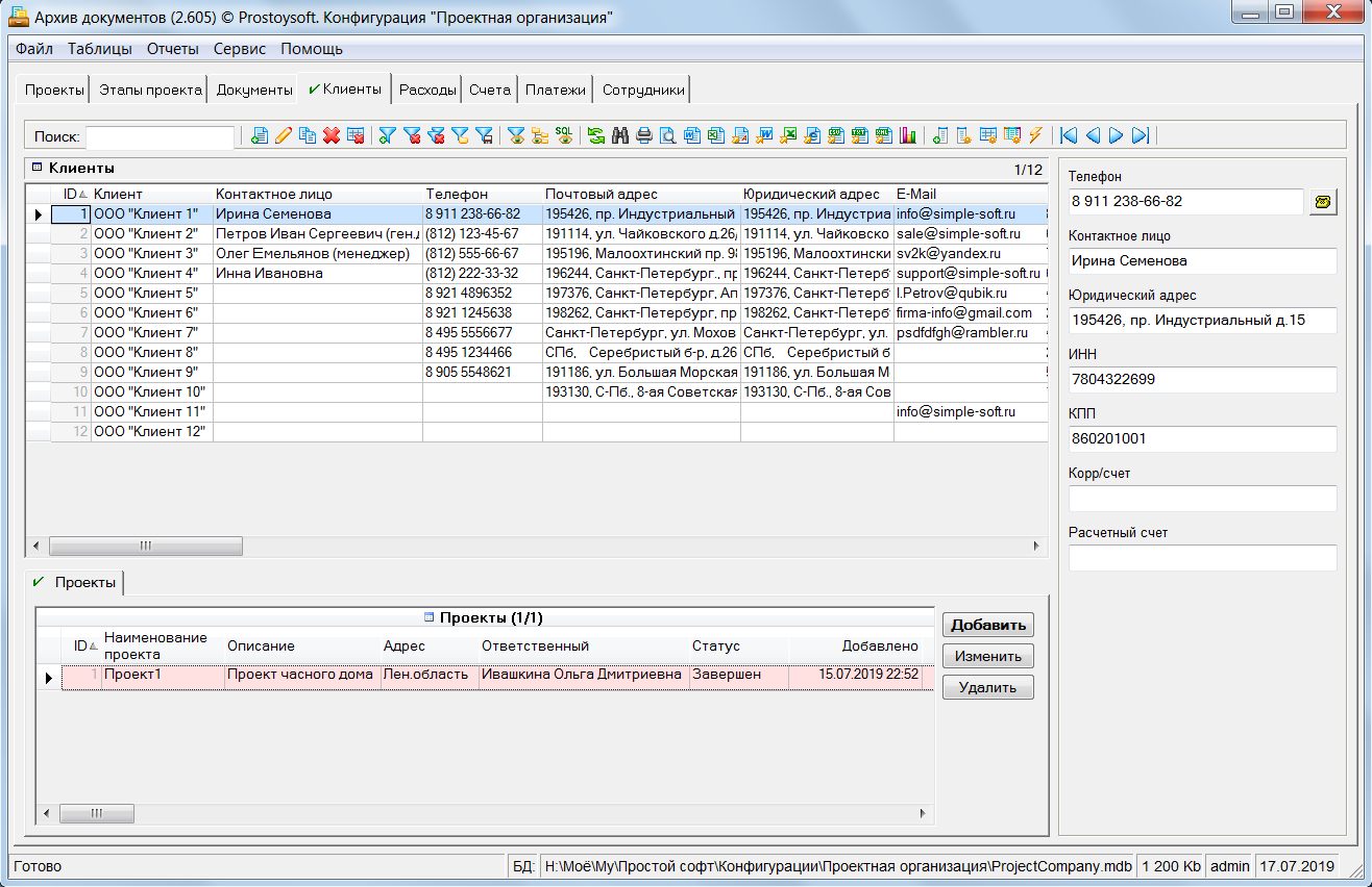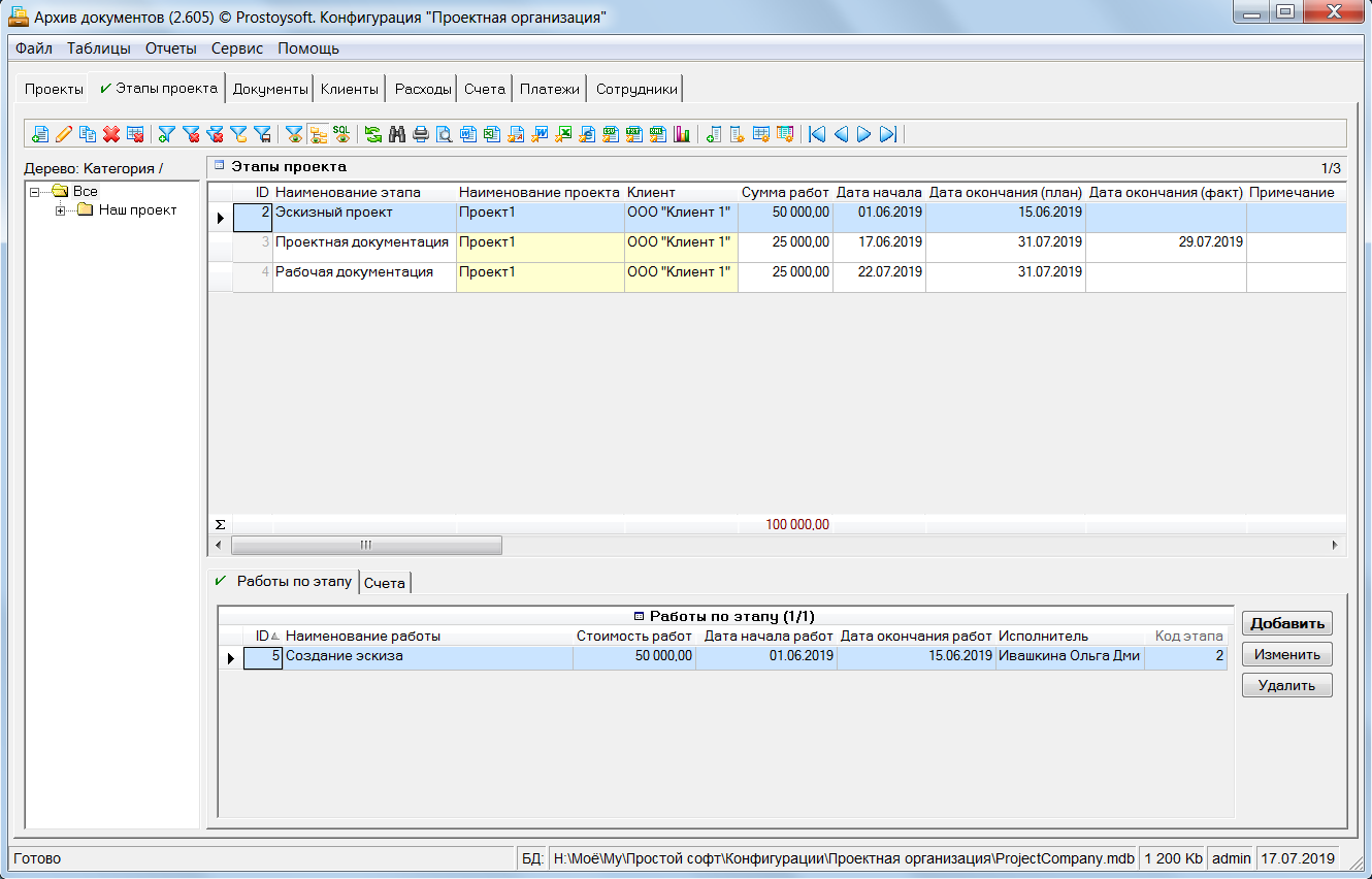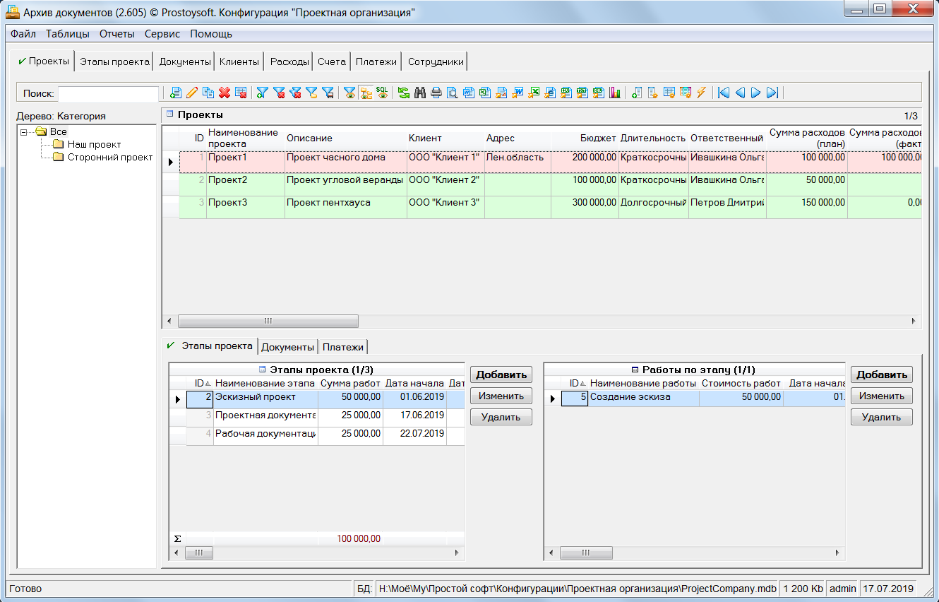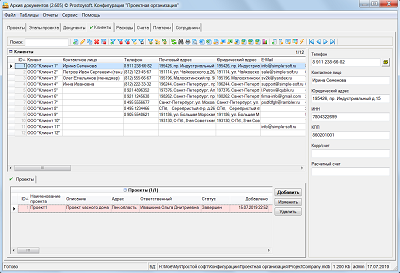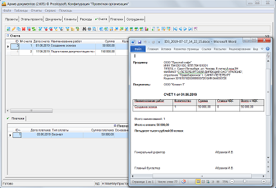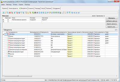Программа "Проектная организация" - предназначена для ведения учета в организациях оказывающих услуги по разработке различных проектов и позволяет быстро и эффективно наладить основные процессы управления проектами. Для более удобного ведения учета все проекты разбиваются по этапам, и по каждому этапу формируется план работ с указанием сроков и назначением исполнителей. По всем проектам ведется учет документации с возможностью хранения файлов документов напрямую в базе данных и последующим открытием документов для просмотра напрямую из БД. Так же данная программа позволяет вести учет клиентов, формировать счета на оплату, контролировать входящие платежи, вести учет расходов организации и формировать различные аналитические отчеты.