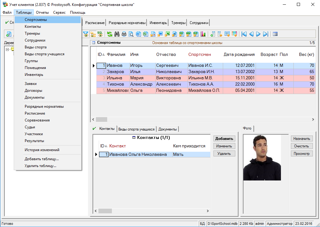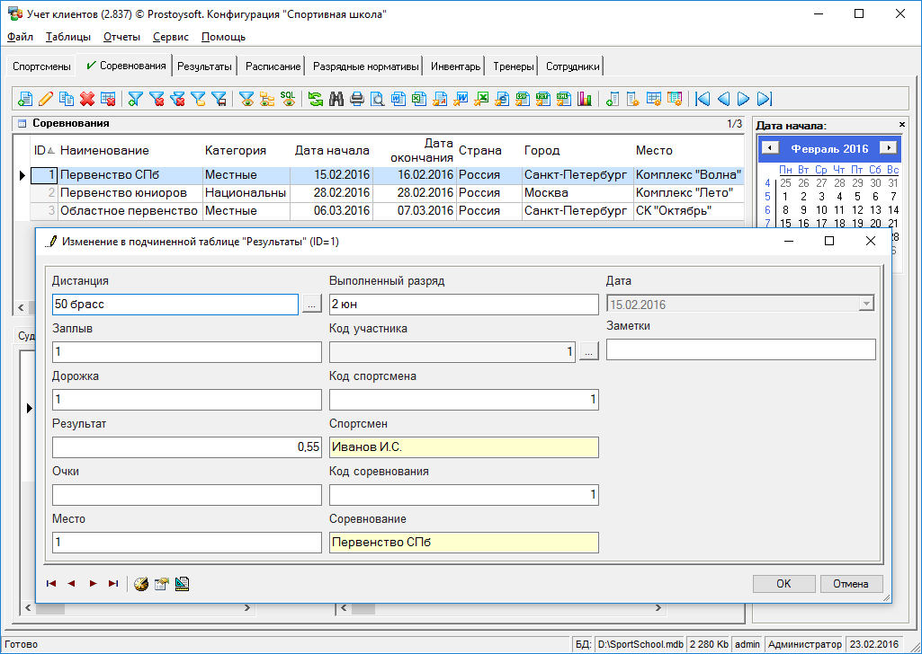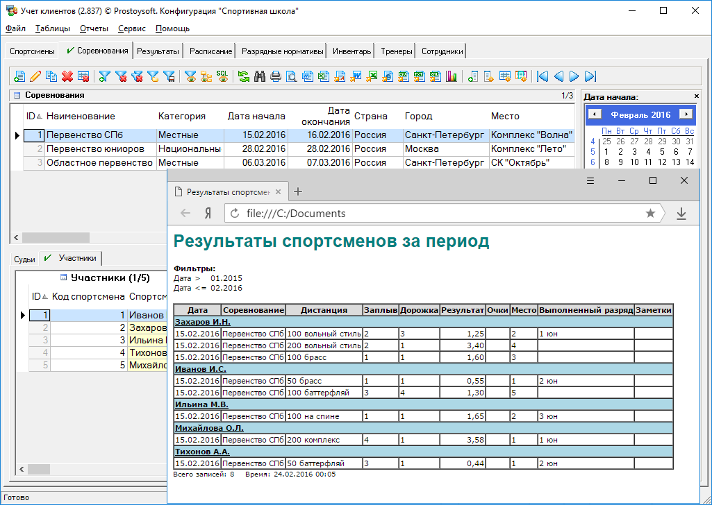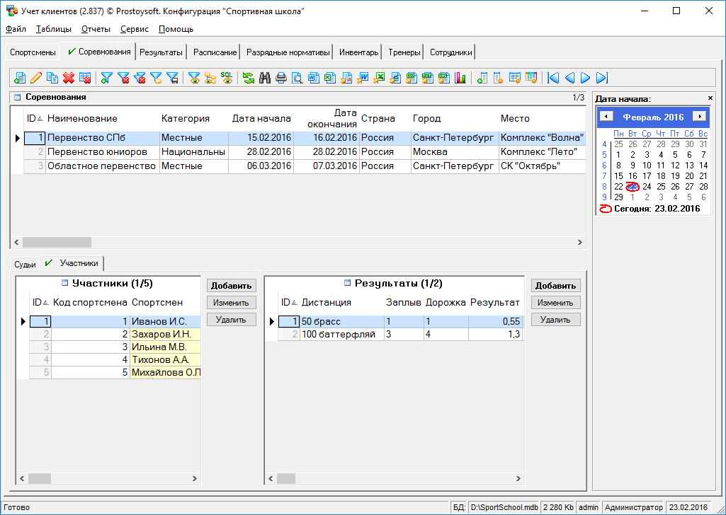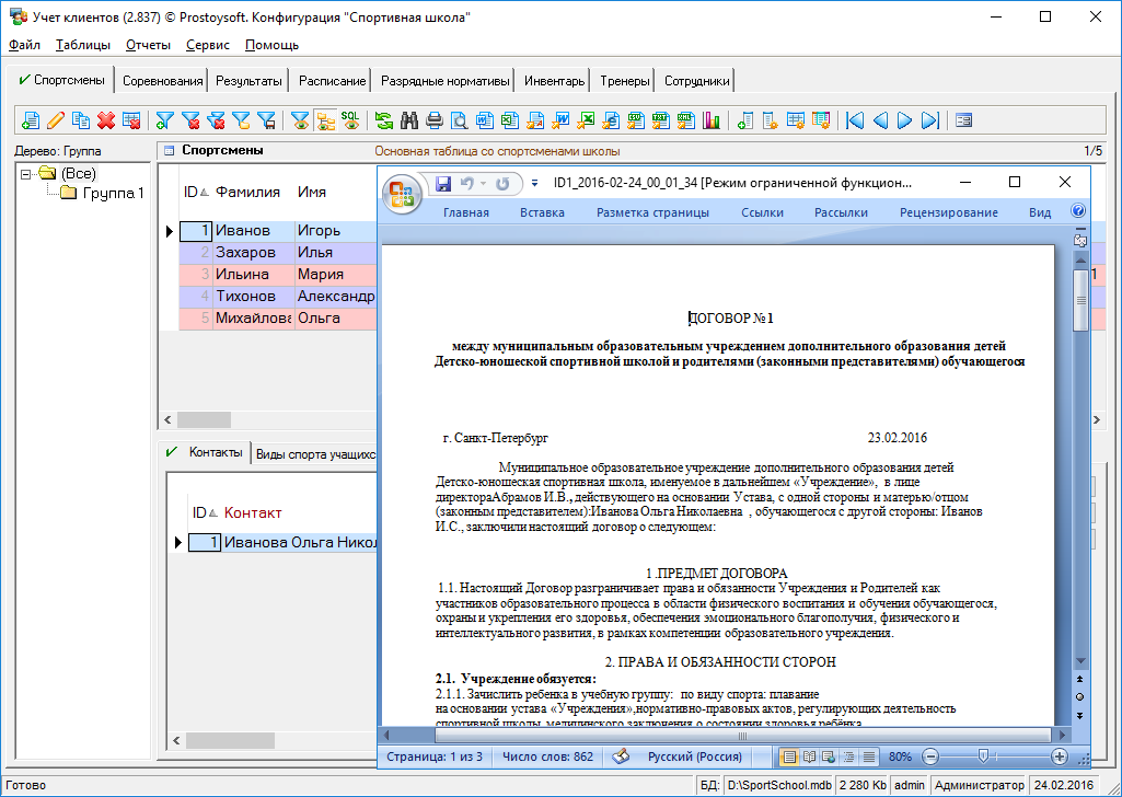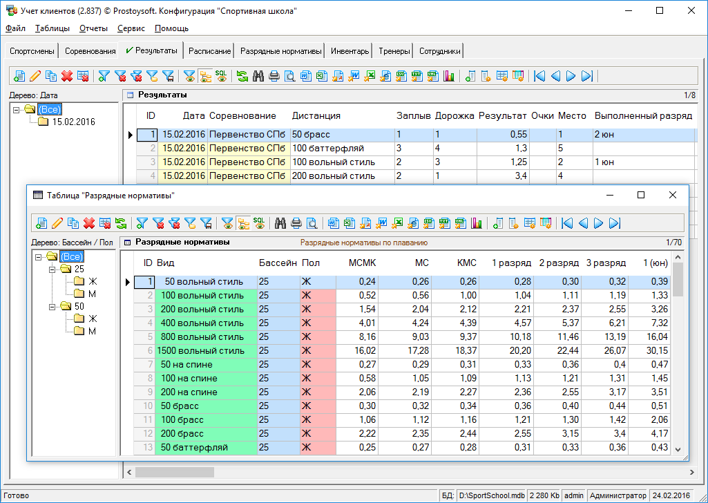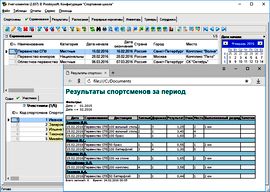 Программа "Спортивная школа" - предназначена для автоматизации учебно-тренировочного процесса в спортивных школах. Данная конфигурация может быть использована для автоматизации спортивных школ водных видов спорта. Программа позволит усовершенствовать рабочий процесс благодаря ведению всестороннего учета. Имеется возможность учета спортсменов-учащихся, тренерского состава, участия в соревнованиях и сборах, спортивных результатов учащихся, внутренних документов учреждения и многое другое.