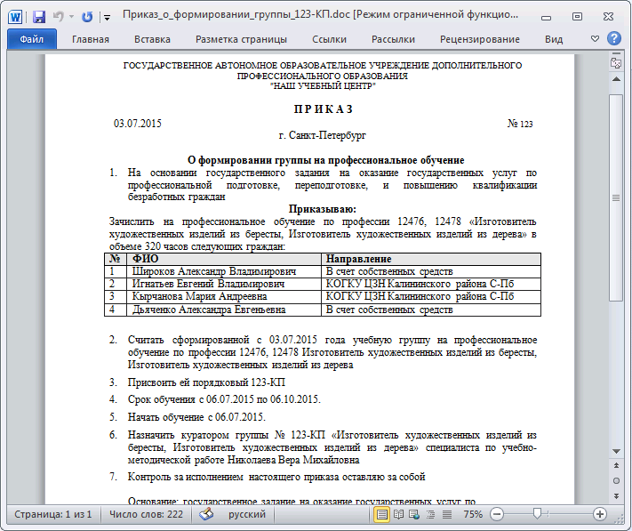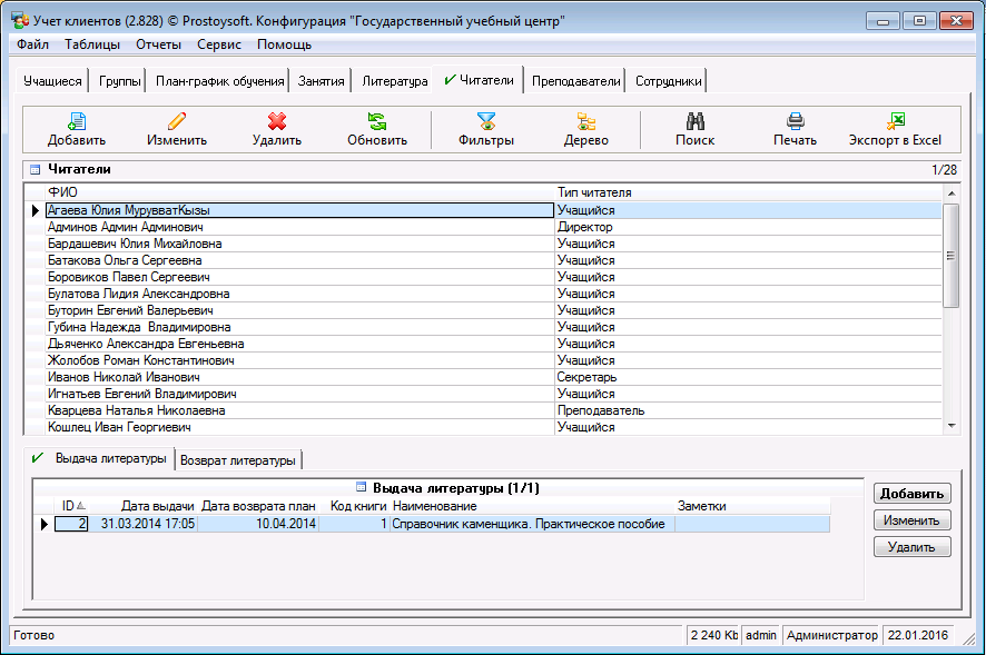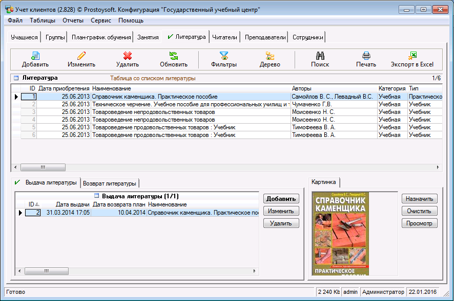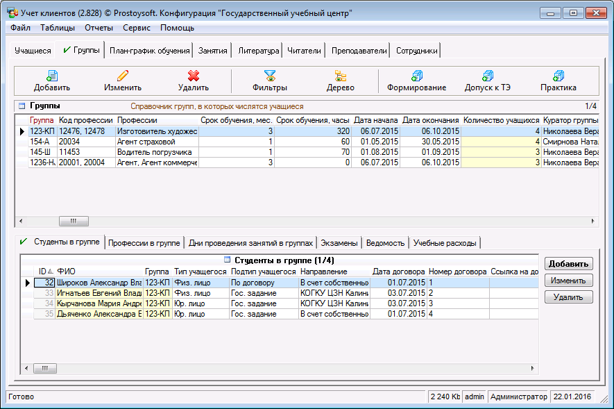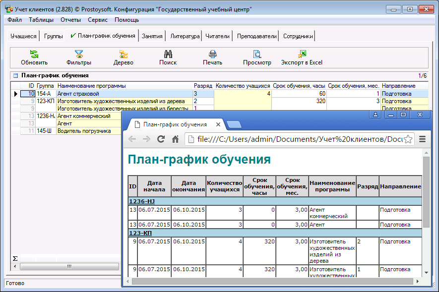 Программа "Государственный учебный центр" - предназначена для автоматизации работы государственных образовательных учреждений. К таким образовательным учереждениям могут относиться обучающие центры при центре занятости населения, профессиональные училища, техникумы. Конфигурация является незаменимым современным инструментом управления учебным центром, помогает выполнять рутинную работу в несколько кликов. Отличительной особенностью данной конфигурации является наличие различных шаблонов документов, которые ежедневно генерируются учебными центрами(приказы, договора, справки, ведеомости). Конфигурация позволяет автоматизировать все области деятельности учебного центра.