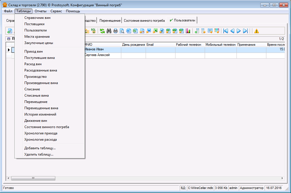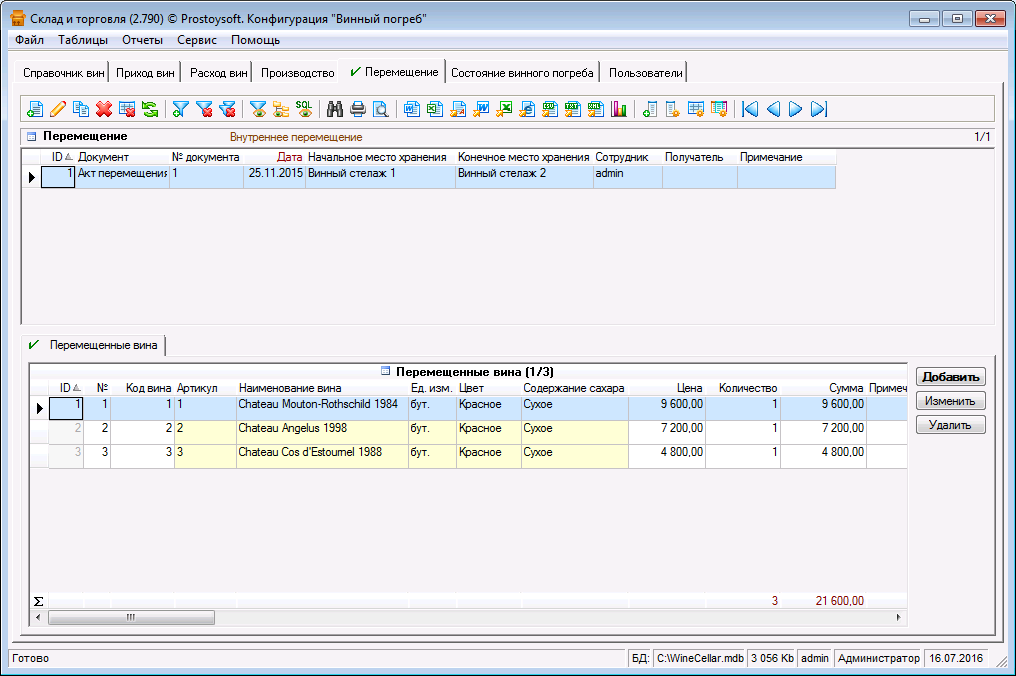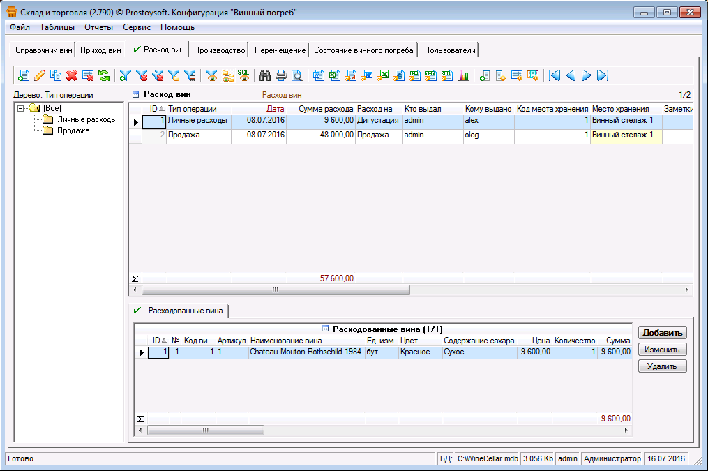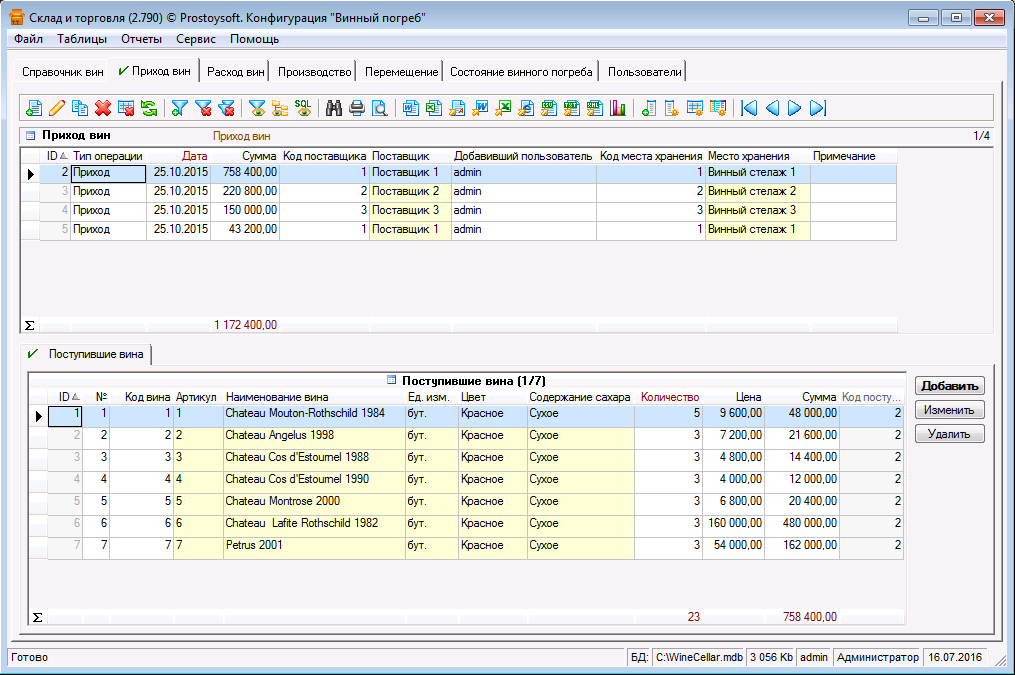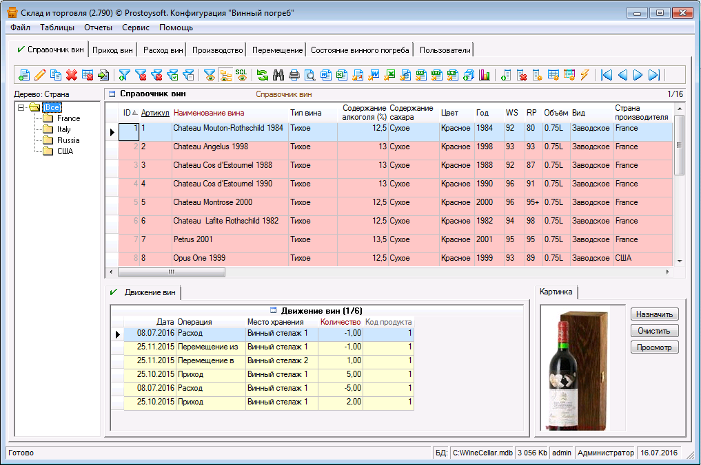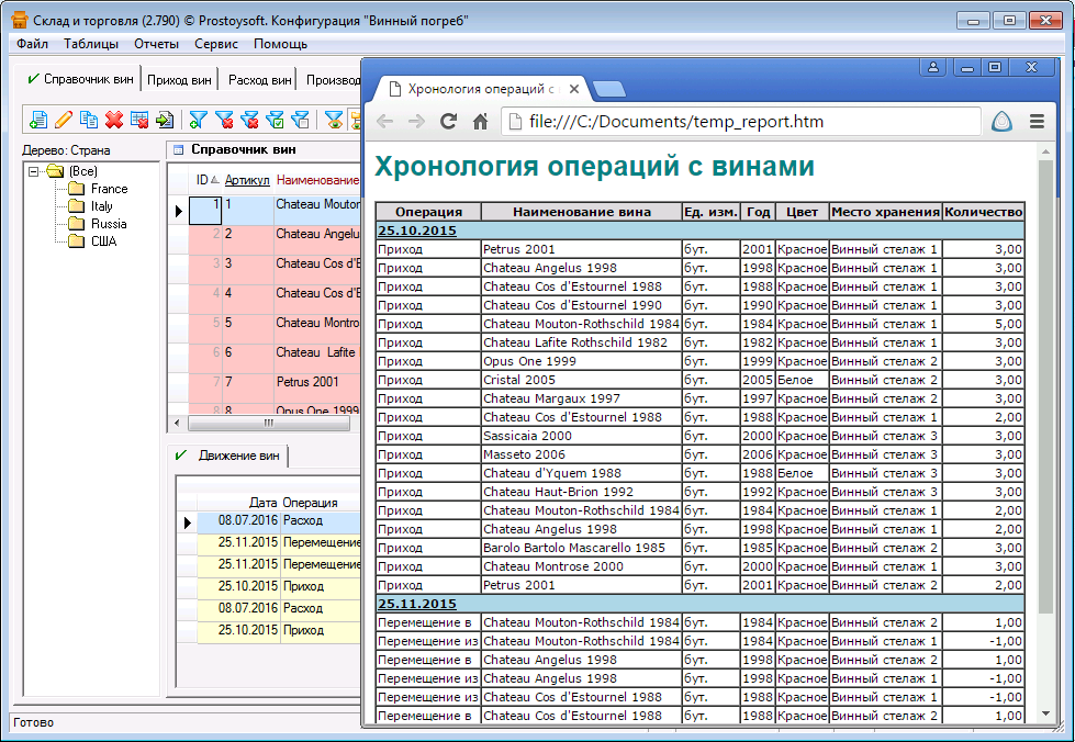 Программа "Винный погреб" - предназначена для автоматизации работы винных погребов, а также систематизации частных винных коллекций. В конфигурации реализованы все задачи, необходимые для грамотной организации формирования собственной винной коллекции. Данная программа поможет вести учет коллекционных вин, их местоположение в погребе, закупочных цен и себестоимость с учетом выдержки в погребе.